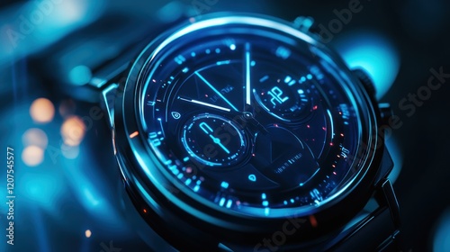 Fototapeta premium Close-up of a futuristic smartwatch with a glowing blue digital interface on a blurred background
