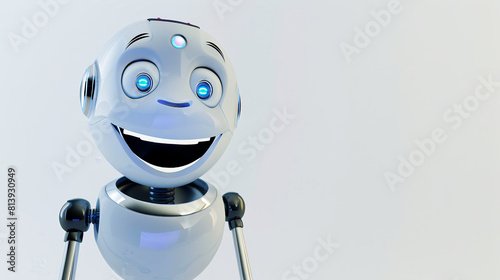 © mshynkarchuk, Naklejka premium Close-up of a futuristic white robot head with a glossy finish, featuring expressive eyes and sleek design, set against a plain white background, highlighting modern robotics and AI technology.
