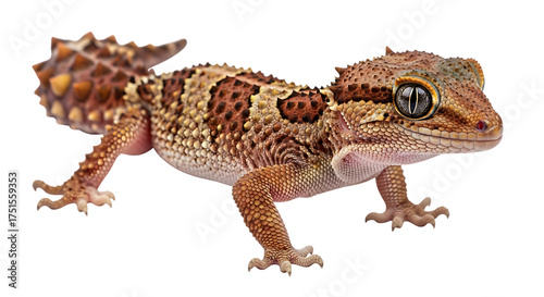© 0Ghost0, Naklejka premium Close up of a gecko with brown and tan scales walking on a black background in a studio setting