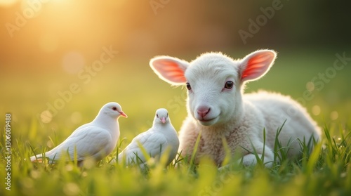 © Kristina, Naklejka premium Close-up of a gentle white lamb resting on fresh grass, two doves beside it