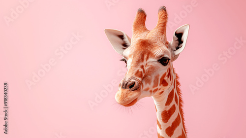 © Volodymyr, Obraz premium Close-up of a giraffe against a pink background. Copy space. Generative AI