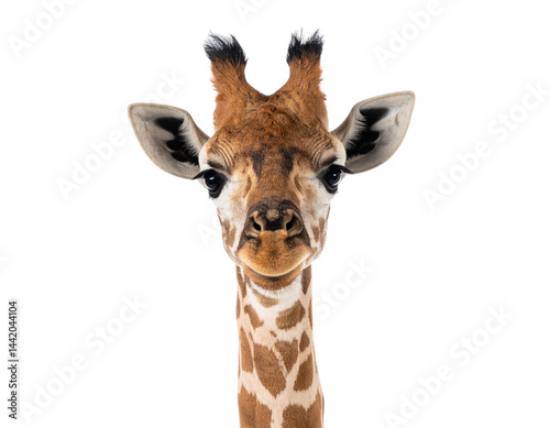 © TransPicHub, Fototapeta premium Close-up of a giraffe's face and neck with distinct markings and expressive eyes.