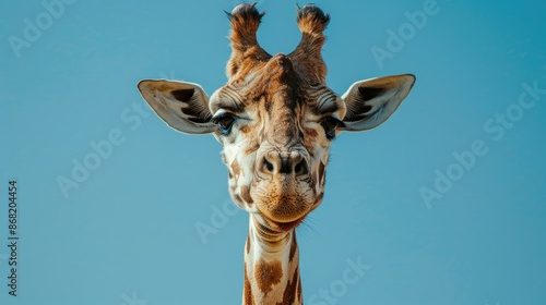© Matcha_09, Naklejka premium Close-up of a giraffe's face, highlighting its spots and the bright blue sky of Africa