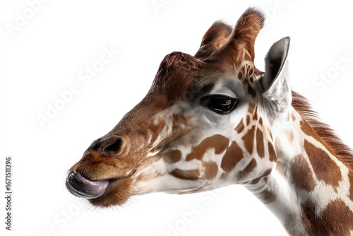 © sima, Naklejka premium Close-up of a giraffe's head and neck, spotted coat, pink tongue protruding