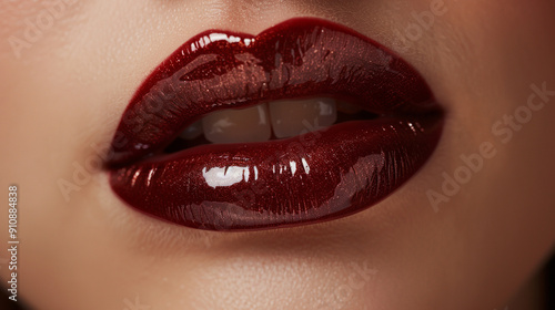Fototapeta premium Close-up of a girl's lips with a hint of gloss over a rich lipstick, capturing the shine and detailed texture