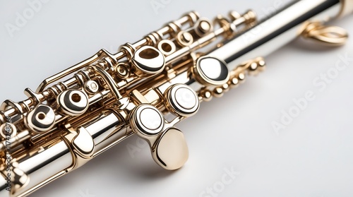 © Eidoran, Naklejka premium Close-up of a gleaming silver flute with gold-plated keys, showcasing intricate detail and musical elegance.