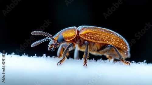 © khairulz, Naklejka premium Close-up of a glistening beetle on a snow-covered surface, showcasing intricate details and textures