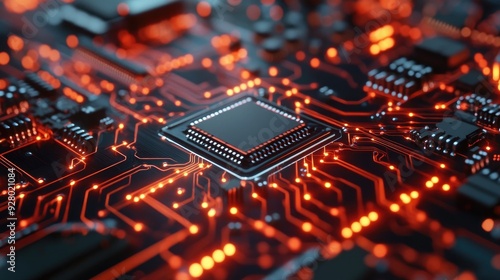 © Jari Magic, Fototapeta premium Close up of a glowing computer chip on a circuit board.