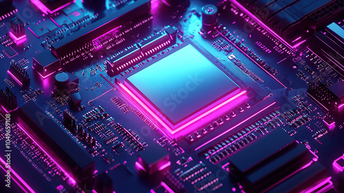 Obraz premium Close-up of a glowing microchip on a circuit board, with a chip in the middle