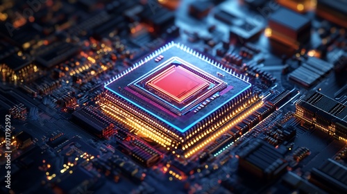 © Enggal Pitoyo, Fototapeta premium Close-up of a glowing processor chip on a circuit board.