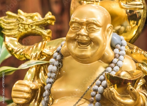 © christian vinces, Fototapeta premium Close up of a golden Laughing Buddha statue (Budai or Hotei) holding a gold ingot. Figure symbolizes wealth, happiness, and good fortune in Feng Shui and Buddhism.