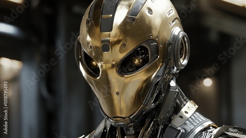 © Edi Purnomo, Fototapeta premium Close-up of a golden robotic head with glowing eyes.