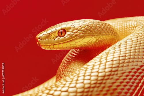 Fototapeta premium Close-up of a Golden Snake with a Red Eye on a Red Background