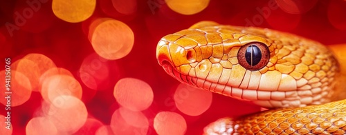 Fototapeta premium Close-up of a golden snake with intricate scales against a vibrant red background, with bokeh effects that enhance its appearance.