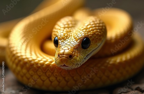 © Bianca, Fototapeta premium Close-up of a golden snake with intricate scales and glossy black eyes, coiled in a natural environment