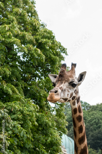 Fototapeta premium Close-up of a gorgeous giraffe face with blurred trees in the background