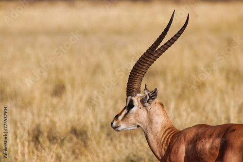 Naklejka premium Close up of a Grants Gazelle with its scimitar like antlers or horns at the Buffalo Springs Reserve in Samburu County, Kenya