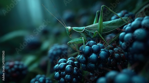 © Alice, Naklejka premium Close-up of a grasshopper perched on grapes and other berries, surrounded by more in the background