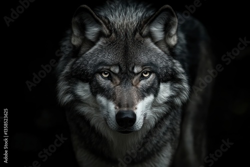 © Niken, Fototapeta premium Close-up of a Gray Wolf with Intense Eyes Staring Forward