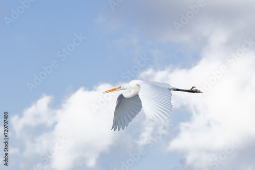 Fototapeta premium Close up of a great egret, Ardea alba, with outstretched body and downward wing beat floating from right to left against background with beautiful blue sky with cumulus clouds