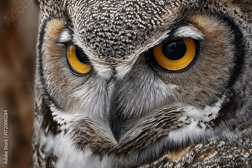 Obraz premium Close-Up of a Great Horned Owl Displaying Intense Gaze and Distinctive Features