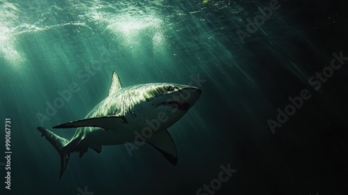 © jodoto, Fototapeta premium Close-up of a Great White Shark Underwater, Showcasing its Power and Predatory Nature in the Deep Ocean