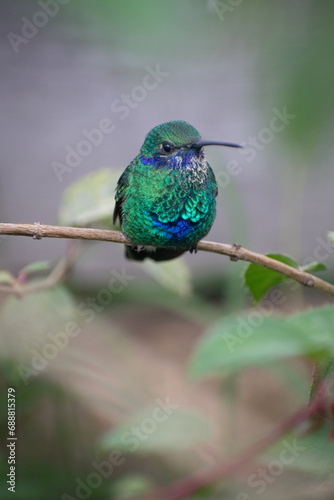 Fototapeta premium Close up of a green and blue hummingbird on a branch.