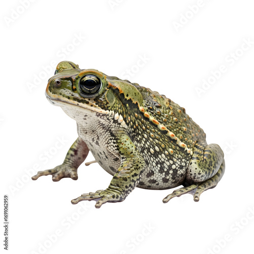 © 0Ghost0, Fototapeta premium Close-up of a green cane toad with rough skin, sitting on a white background.