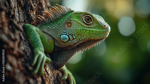 © Kevin, Fototapeta premium Close-Up of a Green Iguana Resting on a Tree Trunk