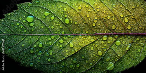 Fototapeta premium Close-Up of a Green Leaf Covered in Water Droplets on Black Background for...