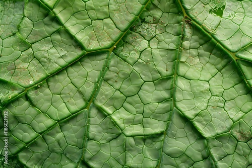 © IvanEsia, Obraz premium Close-up of a green leaf showcasing its intricate vein structure and texture.