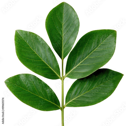 © Pixteegraph, Fototapeta premium Close-up of a green leaf with five vibrant leaflets, isolated on a white background. Ideal for nature, botanical, and eco-friendly themes.