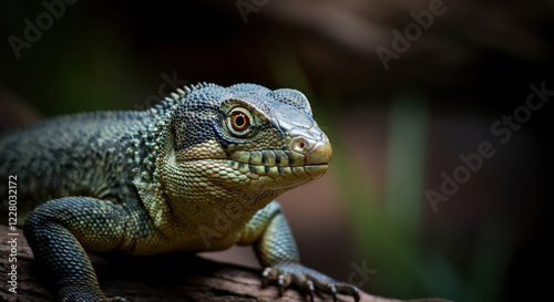 © Alexandr, Obraz premium Close-up of a green lizard resting on a branch in its natural habitat