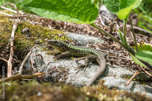 © ismailgazel, Naklejka premium Close-up of a green lizard with intricate yellow-green patterns resting on a moss-covered rock. Perfect for themes of wildlife and ecological diversity.