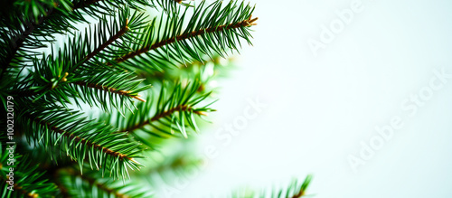 © Rysak, Obraz premium Close-up of a Green Pine Branch on a White Background
