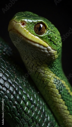 Obraz premium Close-up of a green snake on a dark background.