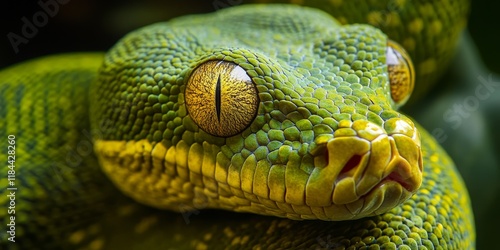 © Levan, Naklejka premium Close up of a green tree python showcasing its vibrant scales and unique features, highlighting the intricate details of the eye of a green tree python in a captivating manner.