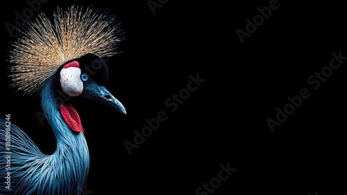 © Anastasiia, Obraz premium Close-up of a grey crowned crane with a golden crest, blue neck and red throat patch against a black background. Concept Close-up Wildlife Portrait, Grey Crowned Crane, Golden Crest Details