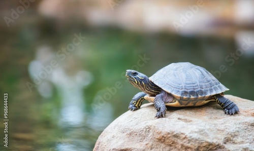 Fototapeta premium Close-up of a grey turtle resting on a rock in a peaceful pond , wildlife,...