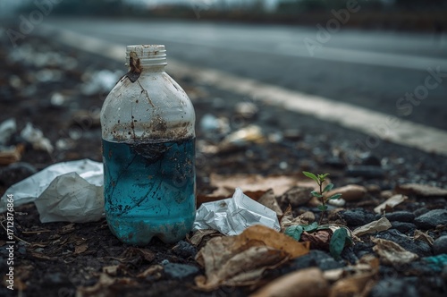 © -Quantum Pixels-, Obraz premium Close-up of a grimy plastic bottle with blurred background