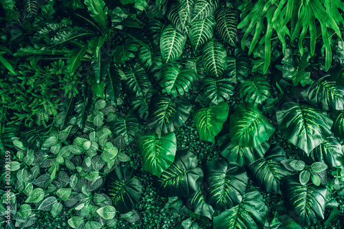 © NewSaetiew, Fototapeta premium Close-up of a group of green leaves, providing a textured and abstract nature background. Rich foliage textures, exotic greenery, and botanical patterns..