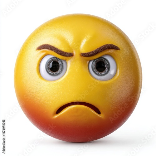 © bipasha, Fototapeta premium Close up of a grumpy yellow emoji face with furrowed brows and a downturned mouth