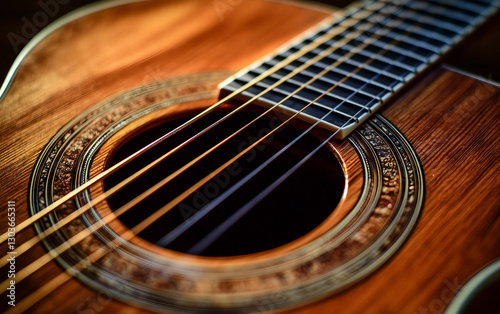 © Rahela2Studio, Fototapeta premium Close up of a guitar with a wooden body and a black string