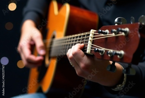 © visualnest, Fototapeta premium Close-up of a guitarist's hands playing an acoustic guitar on a stage. Focus on the expressive hands and the guitar. Recreation and hobby passion concept.