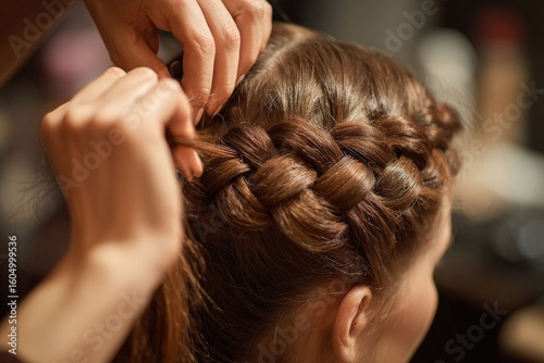 © Shelley, Fototapeta premium Close-up of a hairdresser's hands crafting a French braid on a woman in a beauty salon, with a softly blurred background, highlighting the art of hairstyling.