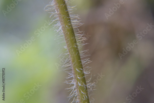 © Take ME, Naklejka premium Close-Up of a Hairy Plant Stem with a Blurred Green Background