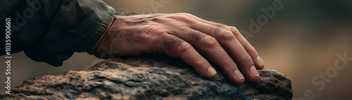 © Eing, Fototapeta premium Close Up of a Hand Resting on a Rock Nature Wilderness Texture Rugged Exploration