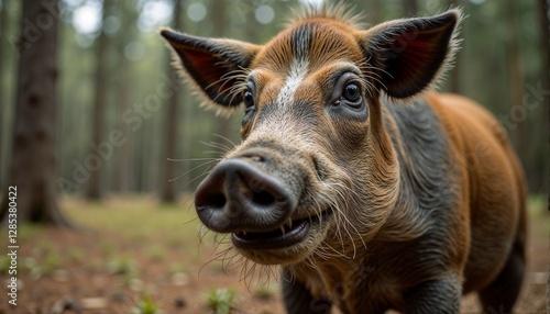 © Natalia, Fototapeta premium Close-up of a happy wild boar in forest with trees in background, copy space