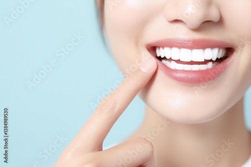© Jannik, Obraz premium Close-up of a happy woman touching her healthy teeth with her finger, isolated on a blue background with copy space