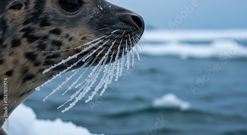 Fototapeta premium Close-up of a harbor seal's face with icy whiskers